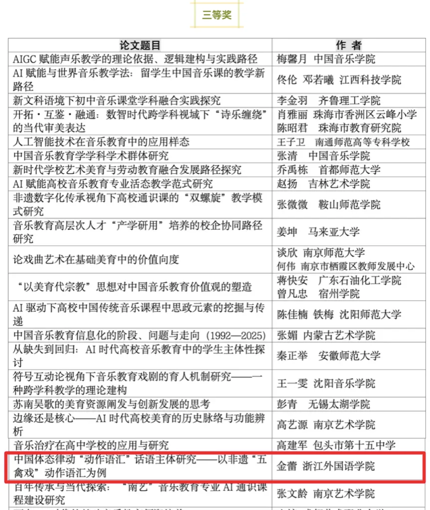 此次两位老师的获奖,充分展现学院高度重视教师在人工智能与教育融合、本土化转型等前沿方向的研究探索,鼓励教师参与高水平学术交流,以拓展教育视野。王娟老师的论文聚焦音乐基础理论课程在数字化与本土化双重转型中的路径设计,体现了学院对智慧教育、课程创新的大力支持;金蕾副教授则从中国传统非遗“五禽戏”中挖掘体态律动教学资源,推动中国音乐教育主体性建构,反映出学院对教师立足本土文化、开展特色研究的培育导向。
