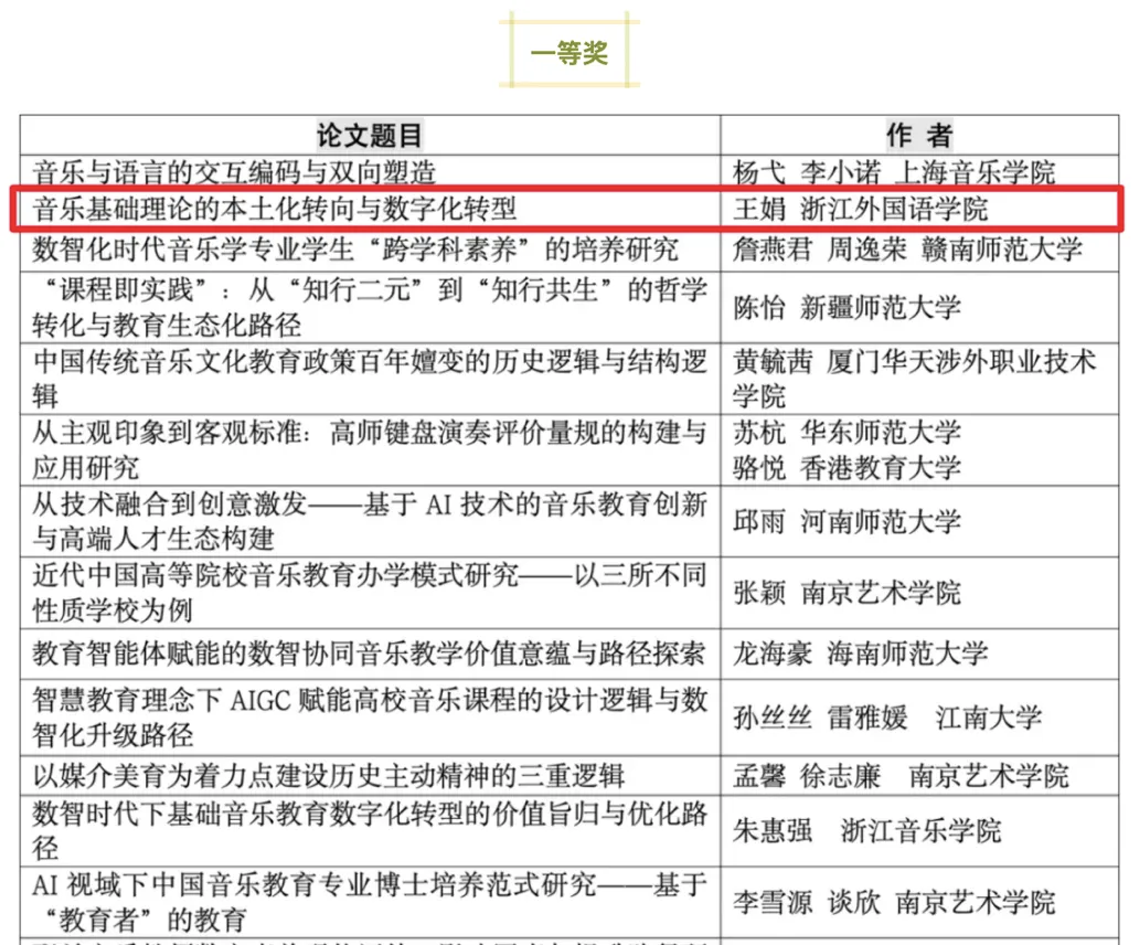 王娟老师的论文《音乐基础理论的本土化转向与数字化转型》获一等奖