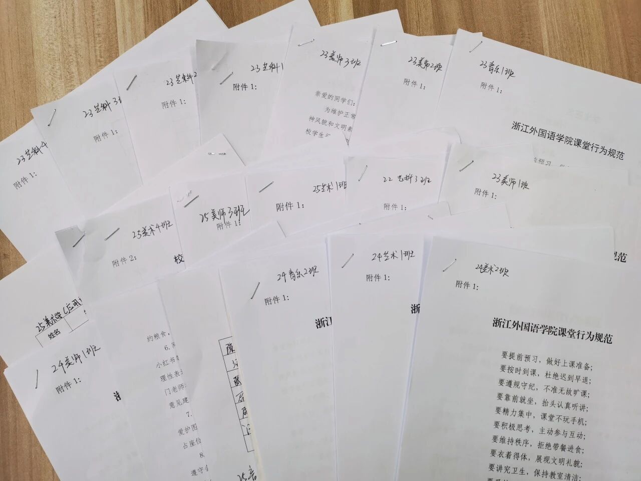 班会过程中,同学们认真聆听、积极互动,并在《浙江外国语学院课堂行为规范》《校园文明礼仪行为规范》倡议书上郑重签字,表达了遵守校纪校规、共建优良学风的信心与决心。