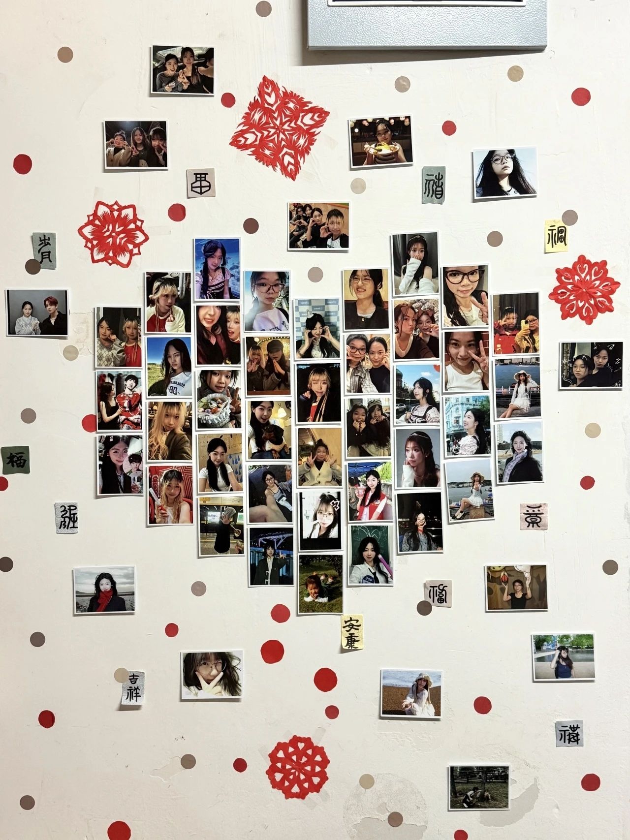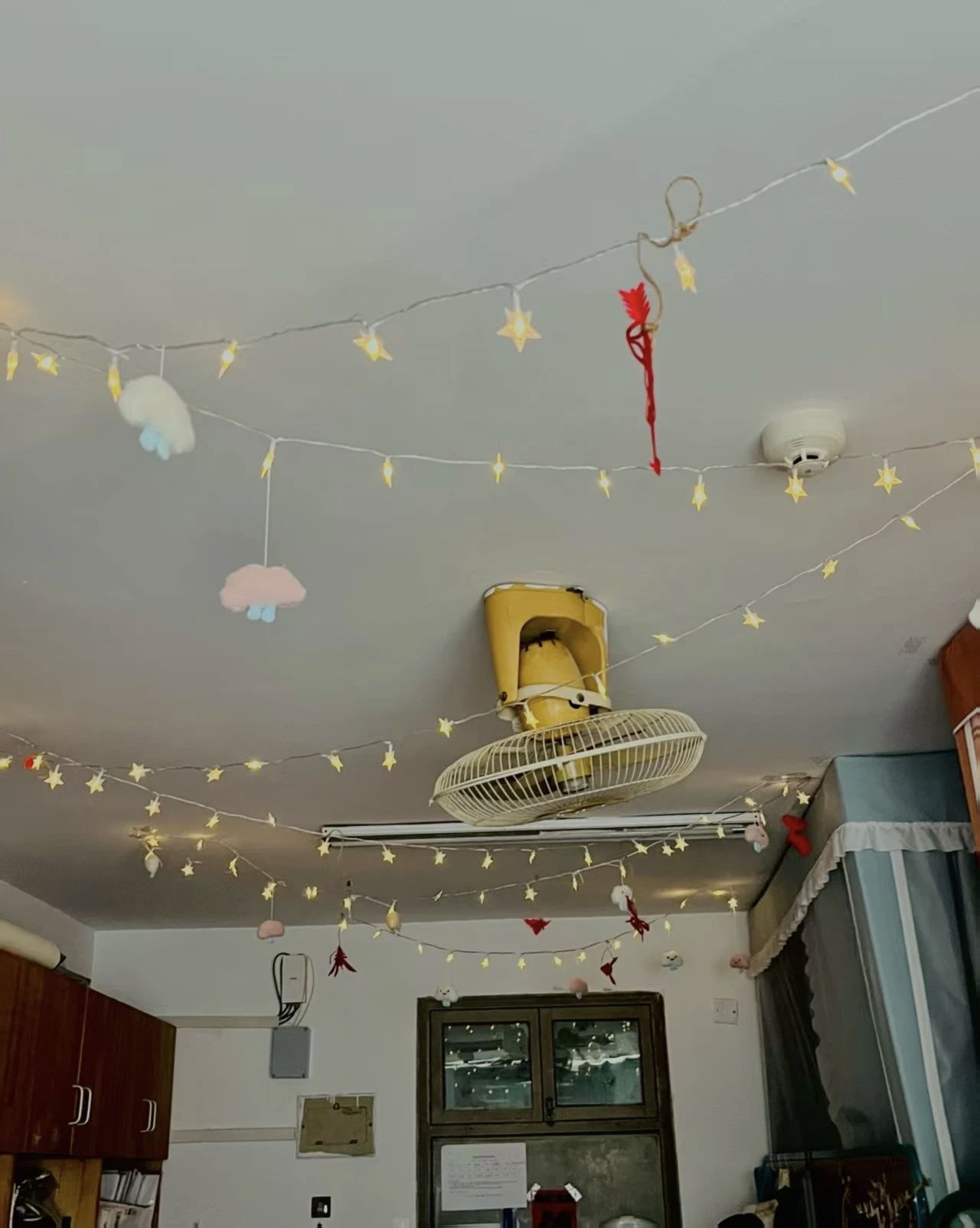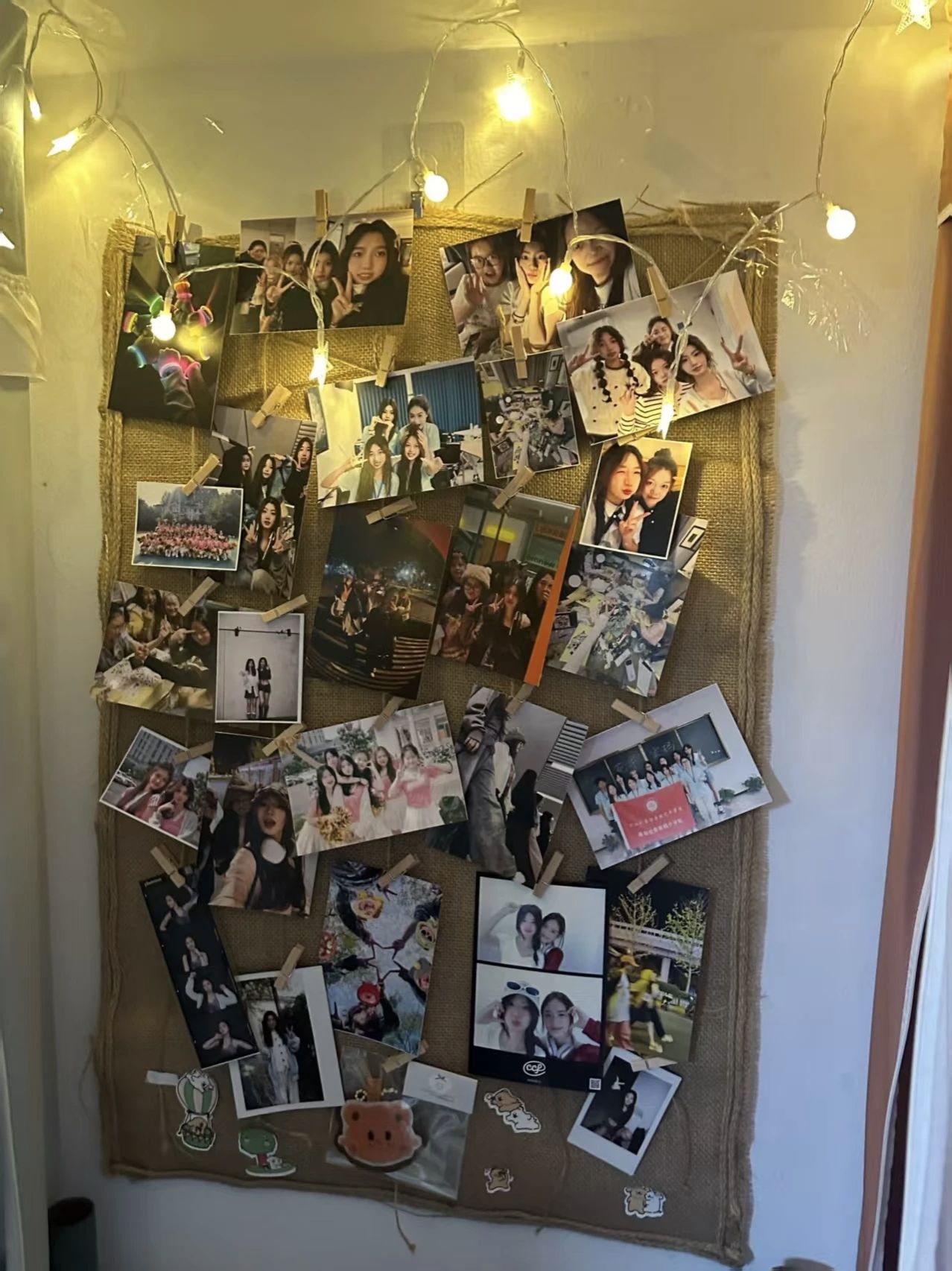 天花板上的星星灯,暖黄的串灯垂落下来,让我们寝室变得更加温馨。玻璃上的红剪纸和窗花、蝴蝶的纹样,均体现了我们的专业特色。我们把攒下的合照用彩色按钉和蝴蝶挂饰缀在板上,每张笑脸都挨着彼此,这都是我们过往的美好回忆。