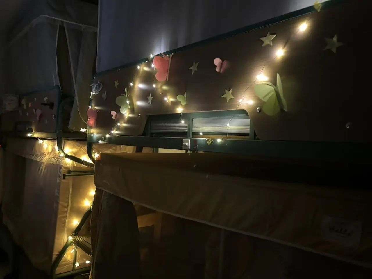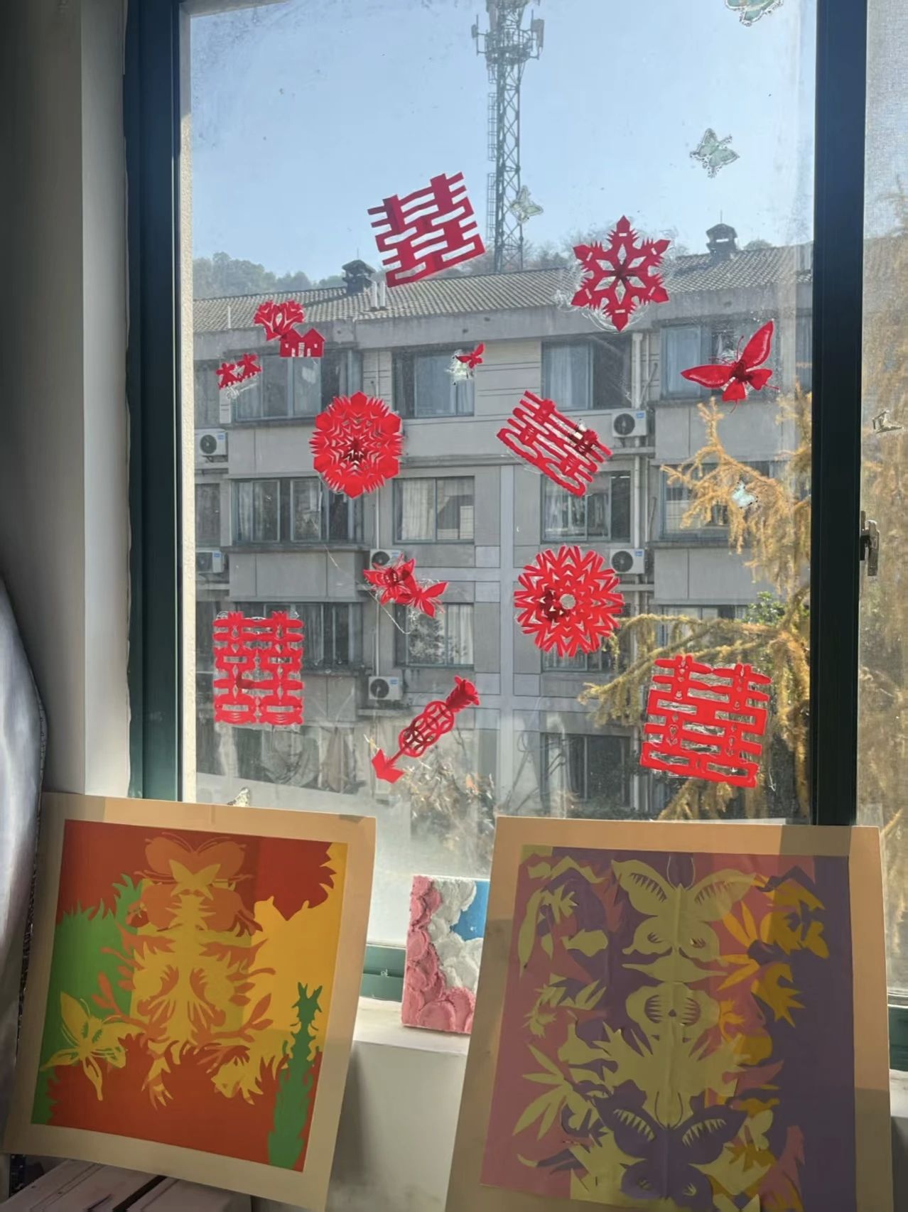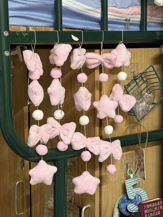 天花板上的星星灯,暖黄的串灯垂落下来,让我们寝室变得更加温馨。玻璃上的红剪纸和窗花、蝴蝶的纹样,均体现了我们的专业特色。我们把攒下的合照用彩色按钉和蝴蝶挂饰缀在板上,每张笑脸都挨着彼此,这都是我们过往的美好回忆。