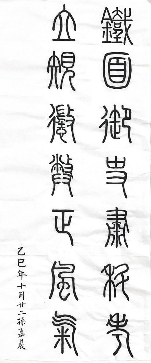 创作说明:作品以小篆书写“铁面御史肃科考,立规惩弊正风气”,赞颂御史刚正不阿、肃清考纪的精神。作品黑白分明,寓意清正廉明。