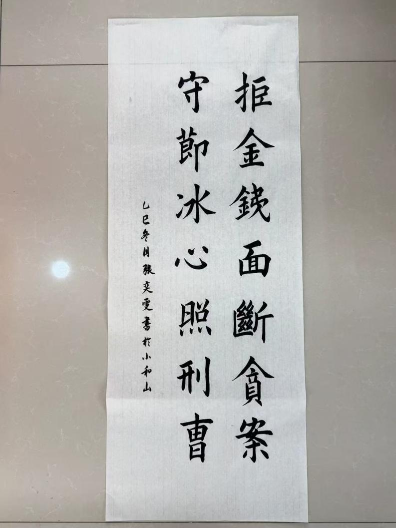 创作说明:这副对联以“拒金铁面断贪案”“守节冰心昭刑曹”为核心,聚焦金光悌拒贿、审案、守廉的关键事迹。上联展现其刚正执法,下联凸显其清廉坚守,通过对仗互补塑造立体形象,彰显其在权势诱惑中坚守正义的崇高精神,呼应历史人物的深远影响。