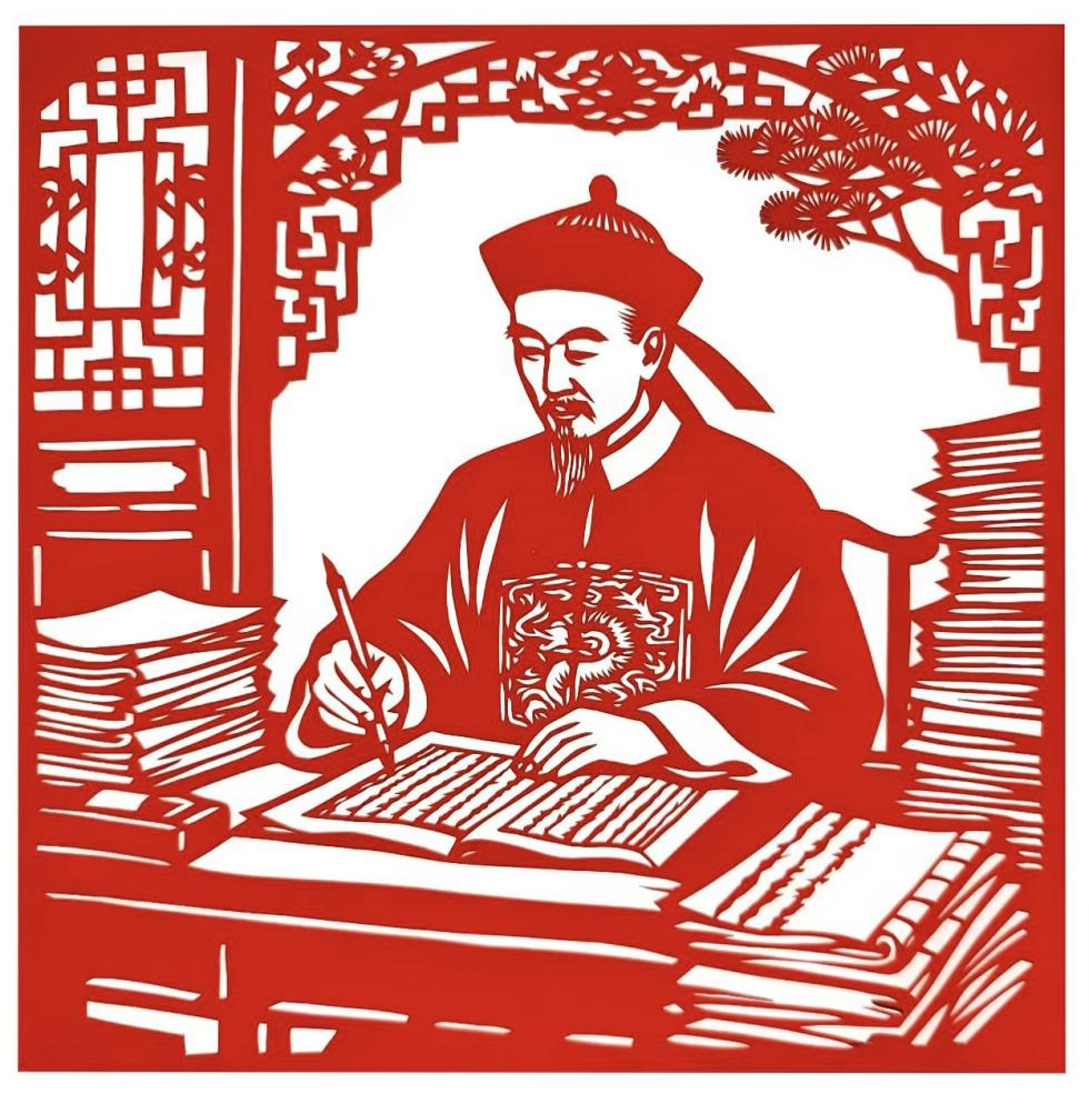 创作说明:这幅剪纸以红底白纹绘张鹏翮伏案著书之景,融书卷、青松与官服补子元素,既彰其治学之勤,更显其为官清廉的品格。