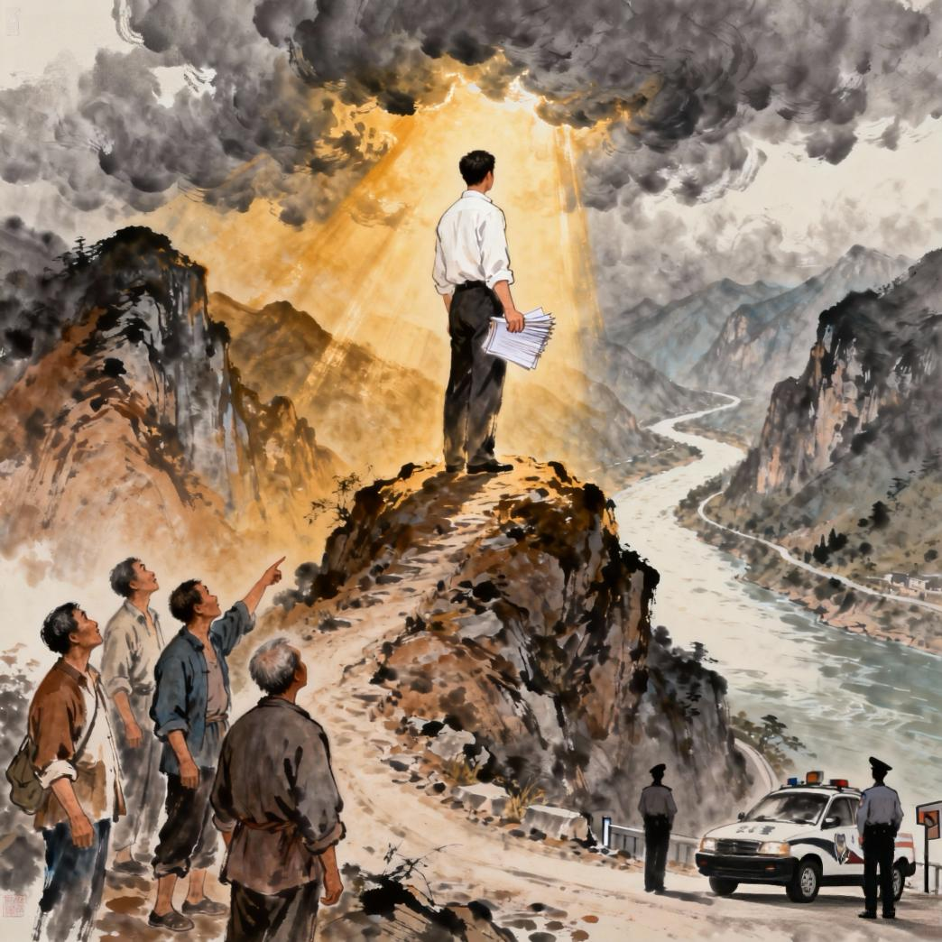 创作说明:这幅作品描绘了一个决定性的黎明。在武陵山区的腹地、长江之畔的巴东,新任县委书记陈行甲,如同画中那道刺破厚重云层的曙光,立于时代的分界线上。画作以光影构图,凝固了一场无声的较量。主人公坚毅的身影是画面的支点,他手中紧握的不仅是证据,更是对五十万百姓的承诺。在他身后,巴东的群山既是壮阔的背景,也是改革路上必须逾越的屏障;在他身前,质朴的乡民代表着土地的期盼与信任。而弥漫在阴影中的无形压力,则在破晓之光下节节退却。“破晓”是自然现象,更是精神隐喻。它意味着最深沉的黑暗之后,光明不可阻挡的到来。这幅画不仅是对一位个人勇气的礼赞,更是对一种信念的刻画:总有人愿做第一缕光,驱散迷雾,照亮前路,为一个地方、一个时代,迎来真正的清晨。