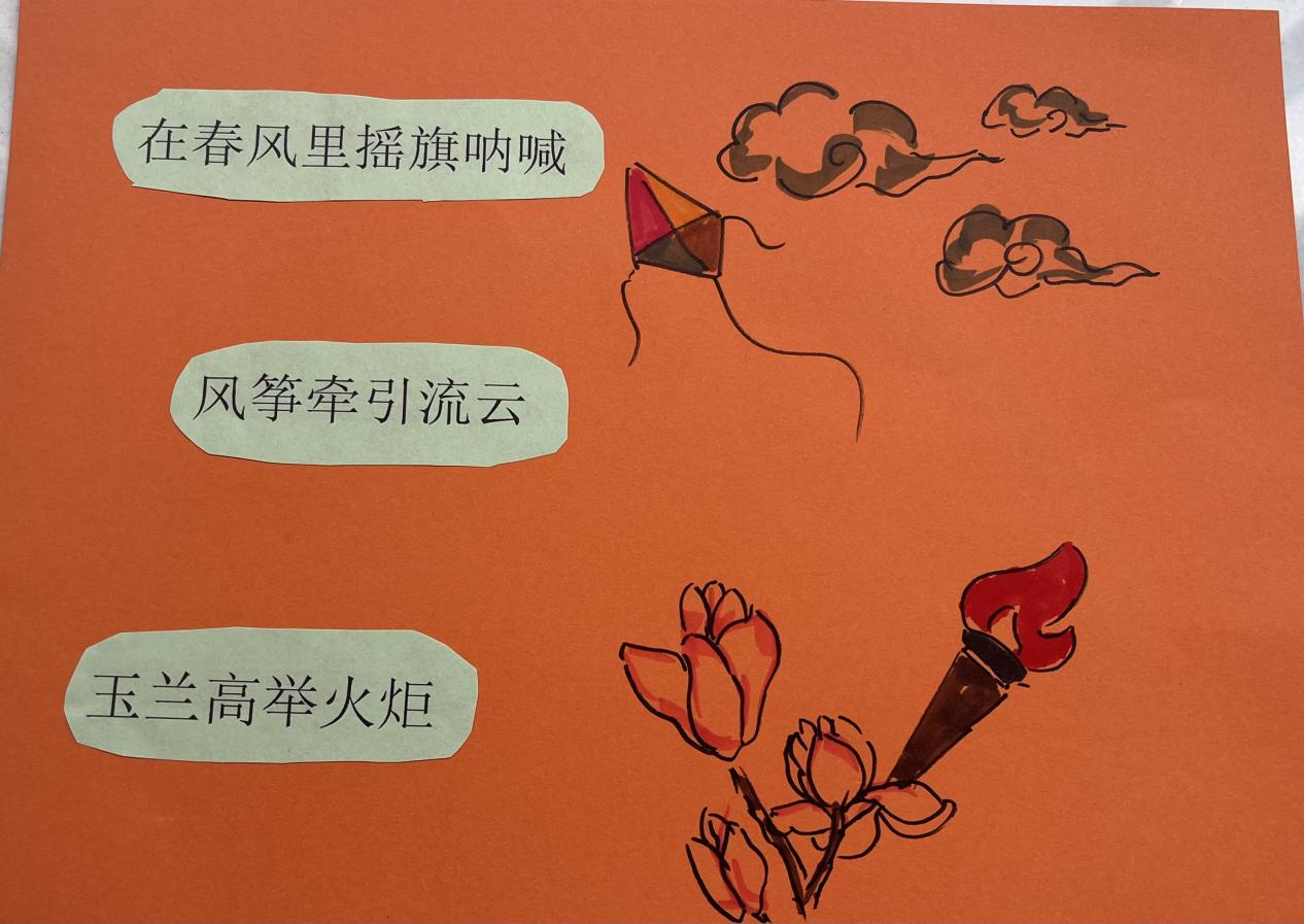 最令人惊艳的当属“诗画同框”环节:画笔游走间,彩纸与画笔勾勒出青春的轮廓。参与的同学表示:“用拼贴和绘画解读诗词,让我第一次体验到画框里的诗词!”漂浮的云朵裹挟着诗句,鲜艳的玉兰花如同火炬高举,诗画相和,沁人心脾。