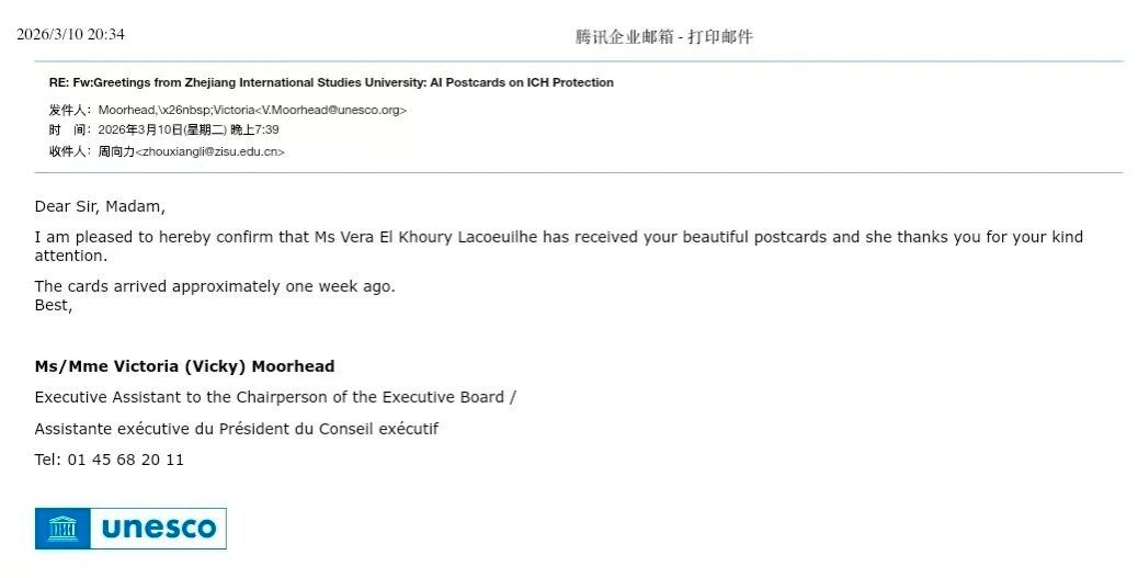 3月10日,我校艺术学院周向力老师收到联合国教科文组织执行委员会回函确认,执行局主席维拉·埃尔·胡里·拉科伊勒(Vera El Khoury Lacoeuilhe)女士已收到我校学生创作的明信片,并对作品表达诚挚谢意。