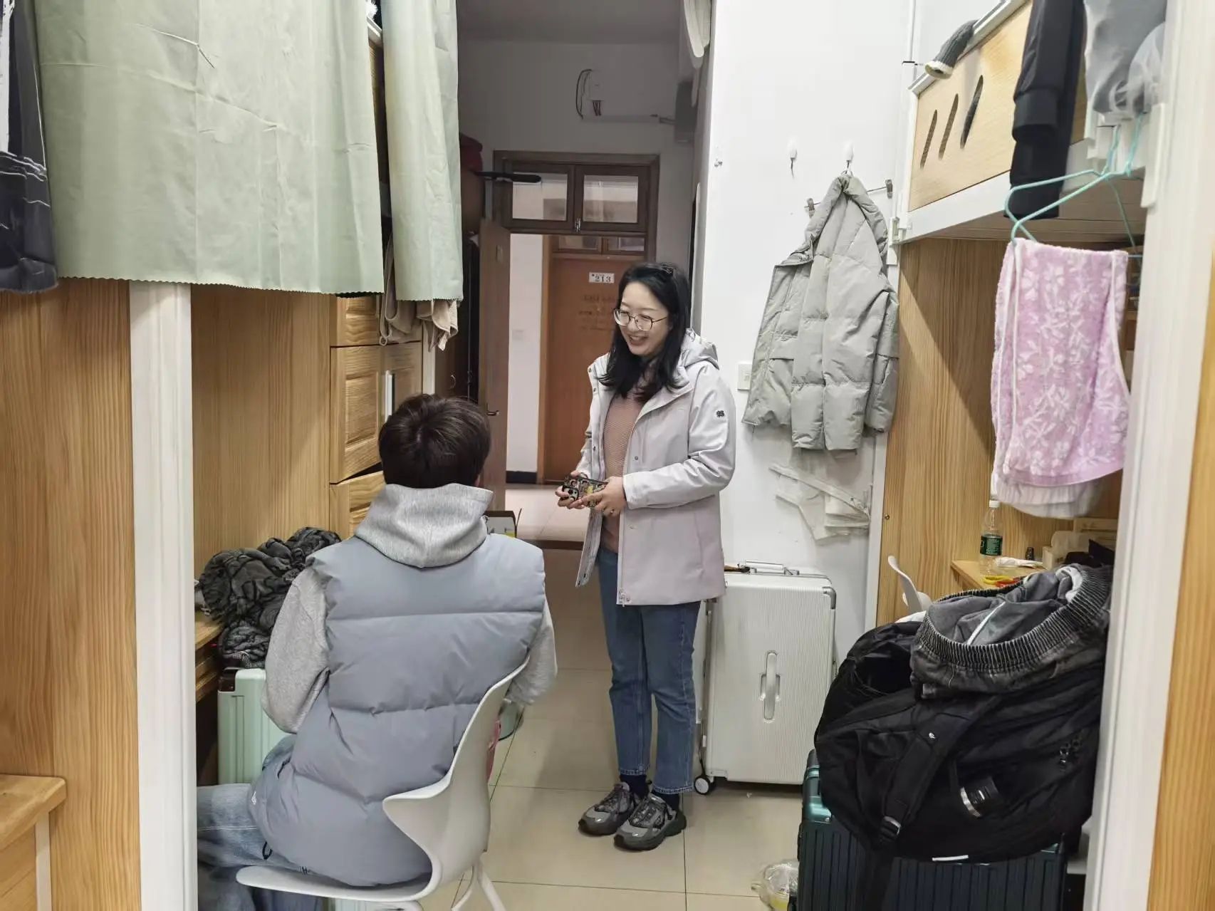 各年级辅导员、班主任积极响应学院号召,在开学两周内深入所带班级每一间学生寝室。走访期间,老师们围绕学生思想动态、学习适应、生活需求等方面与学生深入交流,细致了解同学们的返校适应状况和新学期规划,做好思想引导与人文关怀。同时,老师们严格按照学校要求,重点排查寝室违规电器、私拉乱接电线、充电器长期不拔等用电安全隐患。在卫生检查方面,老师们督促学生保持寝室整洁,注意通风换气,引导大家自觉养成良好生活习惯,共同维护整洁、舒适、安全的住宿环境。