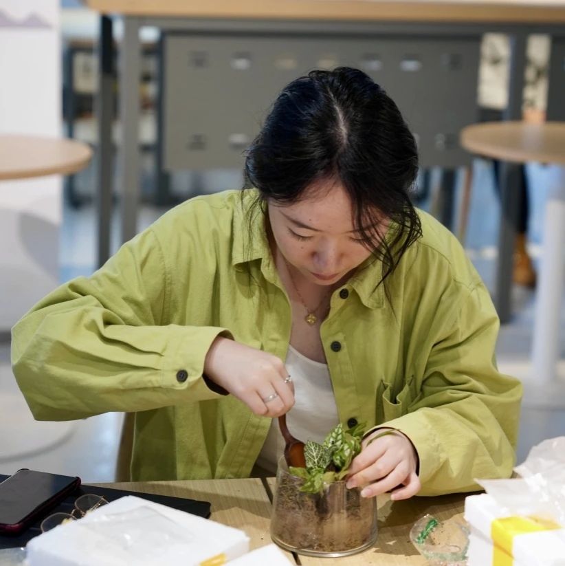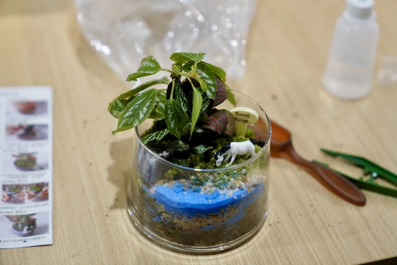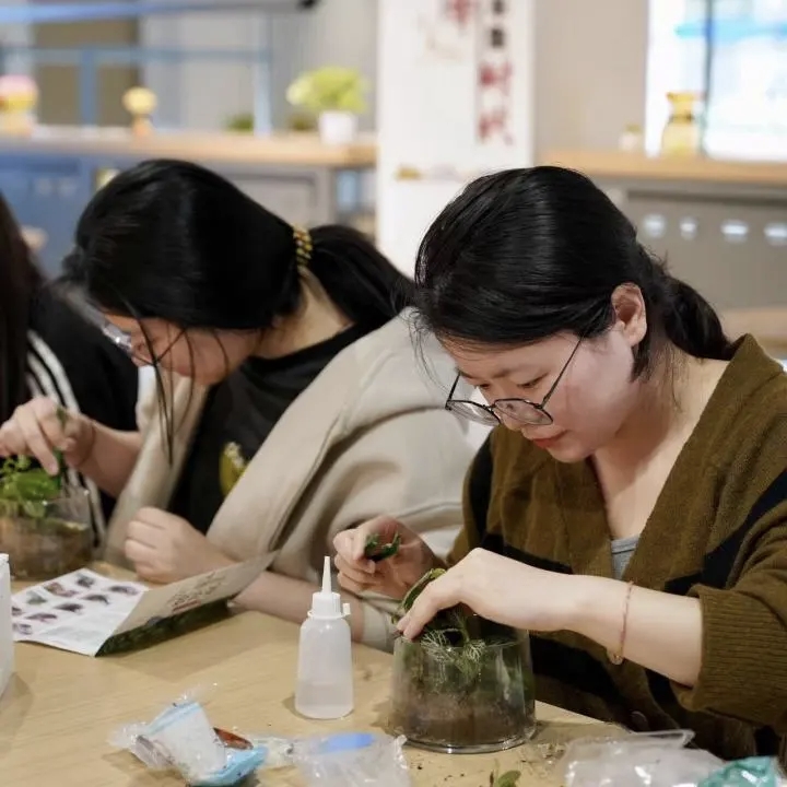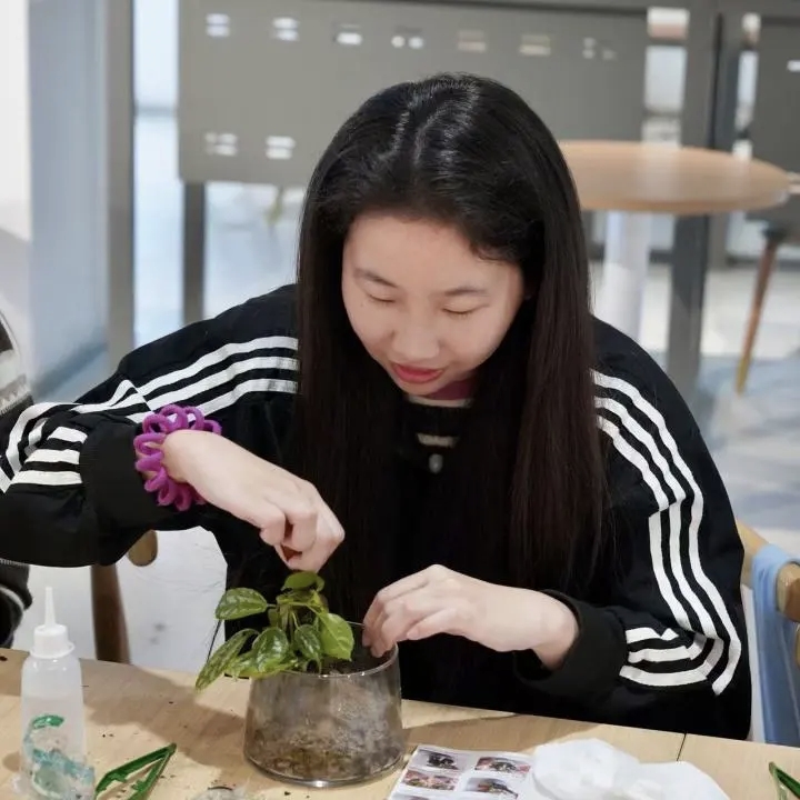 活动伊始,师生们满怀期待地入座,在志愿者的耐心示范下,大家逐步熟悉微景观制作的基本技巧与流程。制作过程中,大家小心翼翼地铺设苔藓、摆放植物,再搭配迷你小房子、卡通人物等摆件,一步步构建出属于自己的“迷你小世界”。